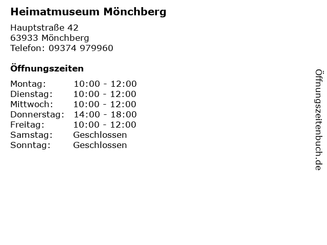 | Öffnungszeiten Heimatmuseum Mönchberg in Mönchberg anzeigen | |