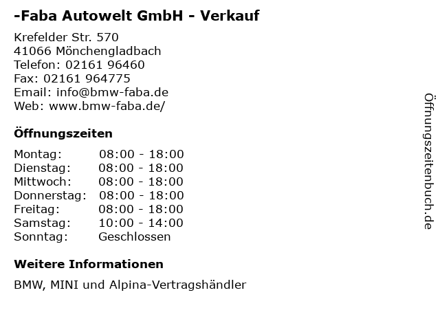 Branchen & Suchbegriffe zu Faba Autowelt GmbH - Verkauf:auto, autohaus, autohändler, autowelt, bmw, kfz, kirsch, mini, neuwagen, pkw, service, verkauf, vertragshändler, werkstatt, faba |