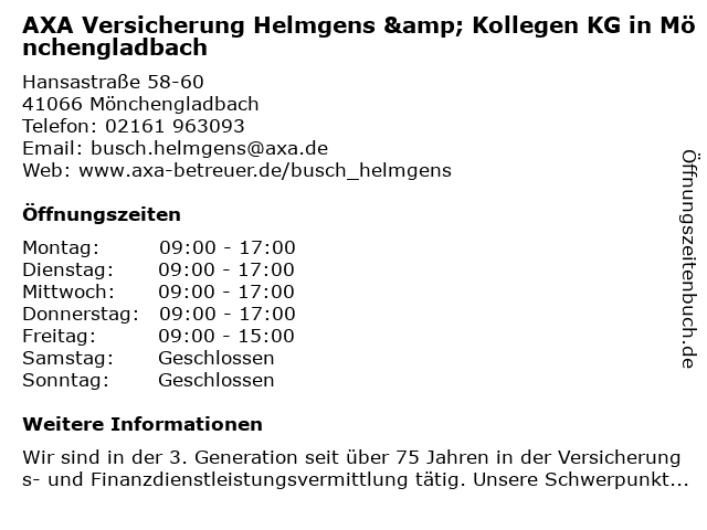 1 Praxis für Zahnheilkunde und Implantologie Dr. Bongartz MSc MSc & Kollegen (Entfernung: 1,43 km) Krahnendonk 7, 41066 Mönchengladbach 2 AXA Versicherung - Generalvertretung Oliver Marquardt (Entfernung: 2,68 km) Peter-Nonnenmühlen-Allee 7, 41063 Mönchengladbach 3 AXA Versicherung - Generalvertretung Görtz & Babic oHG Partneragentur (Entfernung: 3,05 km) Folradstr. 4, 41065 Mönchengladbach 5 AXA Versicherung - Hauptvertretung Michael Effer (Entfernung: 6,12 km) Watelerstr. 38, 41239 Mönchengladbach 6 AXA Geschäftsstelle Klaus Paulußen (Entfernung: 7,18 km) Helmut-Grashoff-Str. 20, 41179 Mönchengladbach |