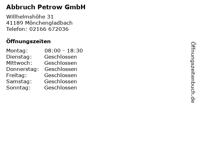 | Öffnungszeiten Abbruch Petrow GmbH in Mönchengladbach anzeigen | |