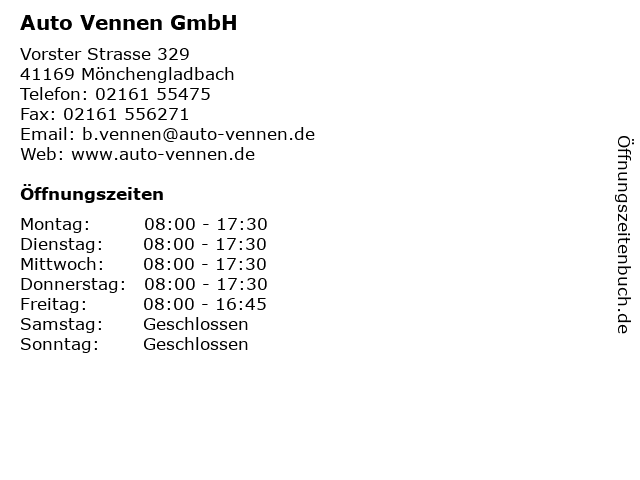 | Öffnungszeiten Auto Vennen GmbH in Mönchengladbach anzeigen | |