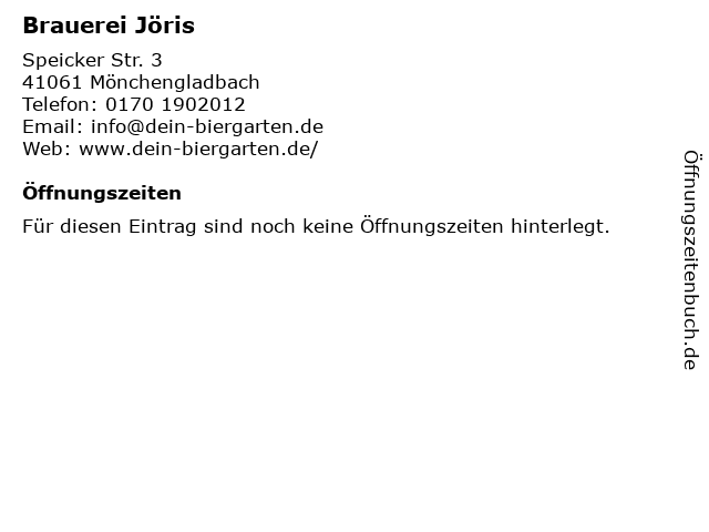 | Öffnungszeiten Brauerei Jöris in Mönchengladbach anzeigen | |