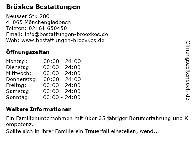 | Öffnungszeiten Bröxkes Bestattungen in Mönchengladbach anzeigen | |