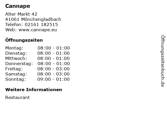 | Öffnungszeiten Cannape in Mönchengladbach anzeigen | |