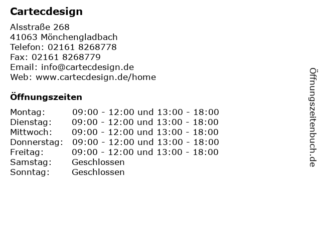| Öffnungszeiten Cartecdesign in Mönchengladbach anzeigen | |