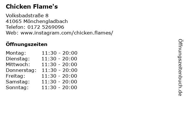 | Öffnungszeiten Chicken Flame's in Mönchengladbach anzeigen | |