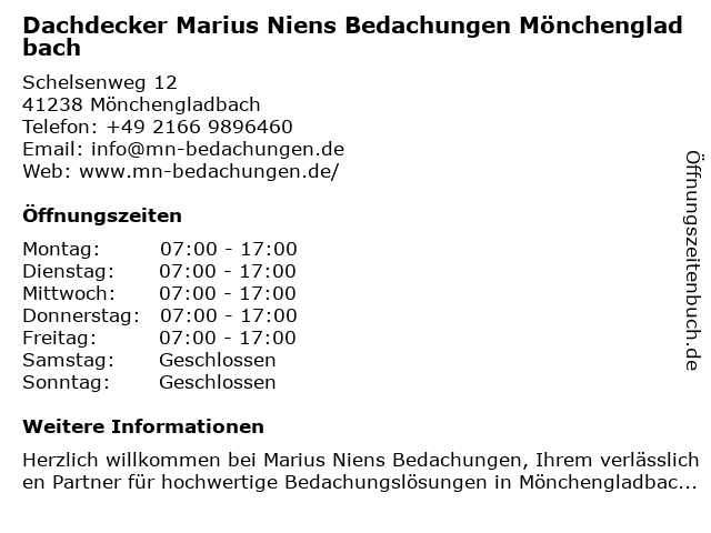 3 Offermanns Dachdecker- Meisterbetrieb (Entfernung: 4,16 km) Mutter-Teresa-Str. 10, 41352 Korschenbroich 6 Dr. med. dent. (R) Marius Catiche MSc - Praxis für biologische Zahnmedizin und Ästhetik (Entfernung: 6,30 km) Bismarckstr. 76, 41061 Mönchengladbach |
