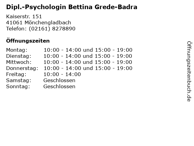 Branchen & Suchbegriffe zu Dipl.-Psychologin Bettina Grede-Badra:badra, bettina, dipl., grede, psychologin, psychotherapie, therapie, verhaltenstherapie |