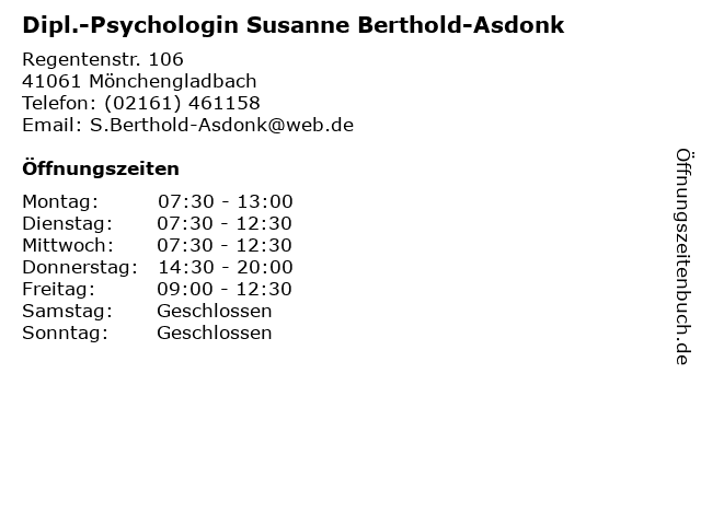 1 Susanne Berthold-Asdonk Psychologische Psychotherapeutin (Entfernung: 0,00 km) Regentenstr. 106, 41061 Mönchengladbach 2 Meyer's Extra - die Kultkneipe in Mönchengladbach-Rheydt Susanne Hünecke (Entfernung: 3,93 km) Bahnhofstr. 46, 41236 Mönchengladbach 5 6 |