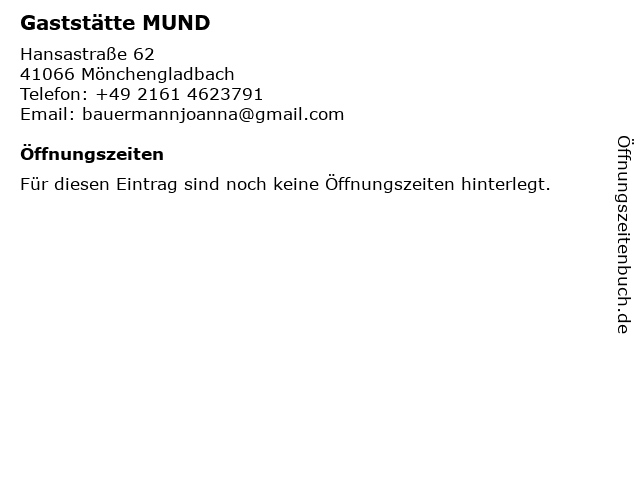 | Öffnungszeiten Gaststätte MUND in Mönchengladbach anzeigen | |