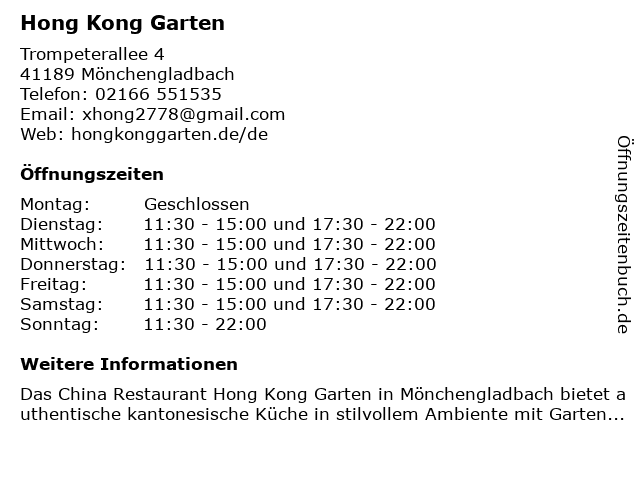 Telefonnummer Hong Kong Garten in Mönchengladbach (02166 551535) anrufen | |