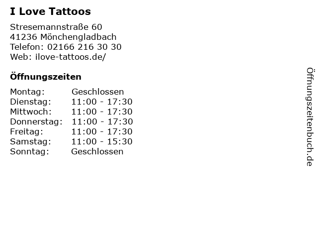 | Öffnungszeiten I Love Tattoos in Mönchengladbach anzeigen | |