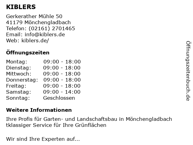 | Öffnungszeiten KIBLERS in Mönchengladbach anzeigen | |