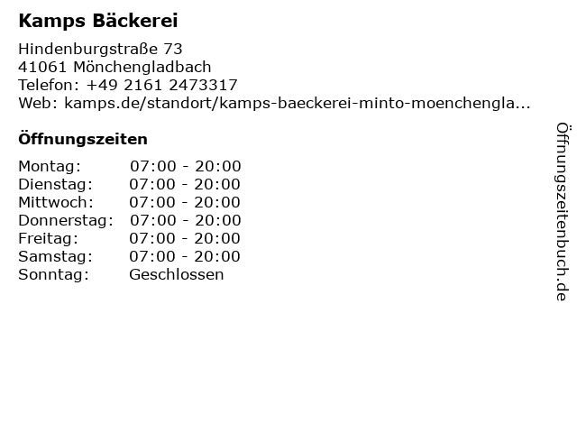 | Öffnungszeiten Kamps Bäckerei in Mönchengladbach anzeigen | |