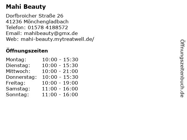 | Öffnungszeiten Mahi Beauty in Mönchengladbach anzeigen | |