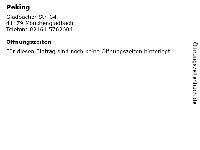 | Öffnungszeiten Peking in Mönchengladbach anzeigen | |