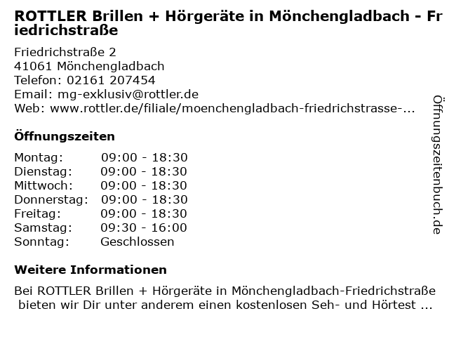 1 ROTTLER Brillen + Kontaktlinsen in Mönchengladbach - Hindenburgstraße (Entfernung: 0,03 km) Hindenburgstraße 100, 41061 Mönchengladbach 6 ROTTLER Brillen + Hörgeräte in Mönchengladbach-Rheydt (Entfernung: 3,18 km) Friedrich-ebert-straße 13, 41236 Mönchengladbach |