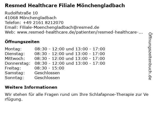 Branchen & Suchbegriffe zu Resmed Healthcare Filiale Mönchengladbach:beratung schlafbezogene atmungsstörungen, cpap-geräte einweisung, cpap-masken anpassung, cpap-zubehör, healthcare, resmed, schlafapnoe-therapie, schlafapnoe-therapie einstieg, schlafapnoe-therapie kontrolle, tipps schlafhygiene |