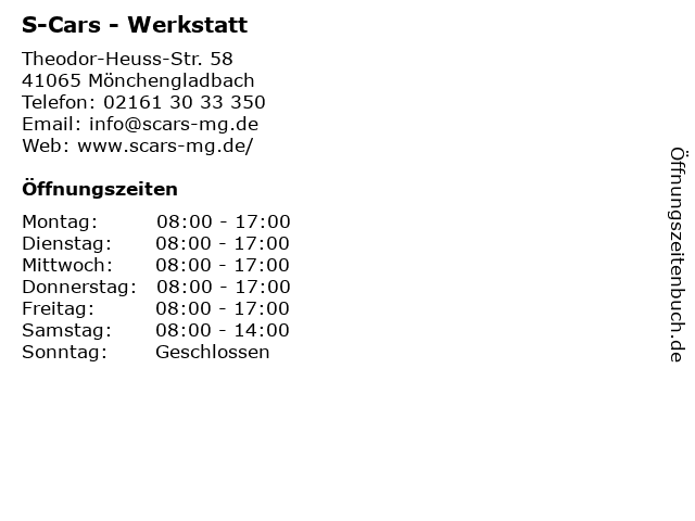 | Öffnungszeiten S-Cars - Werkstatt in Mönchengladbach anzeigen | |