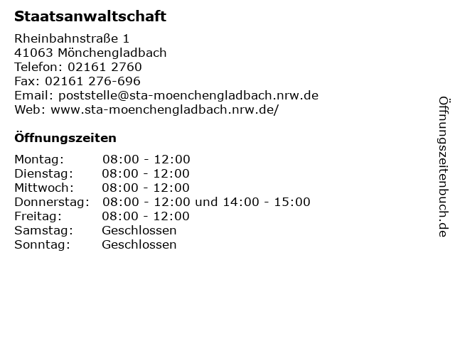 | Öffnungszeiten Staatsanwaltschaft in Mönchengladbach anzeigen | |