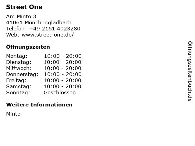 | Öffnungszeiten Street One in Mönchengladbach anzeigen | |