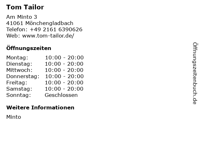 | Öffnungszeiten Tom Tailor in Mönchengladbach anzeigen | |