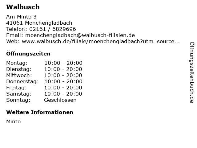 | Öffnungszeiten Walbusch in Mönchengladbach anzeigen | |
