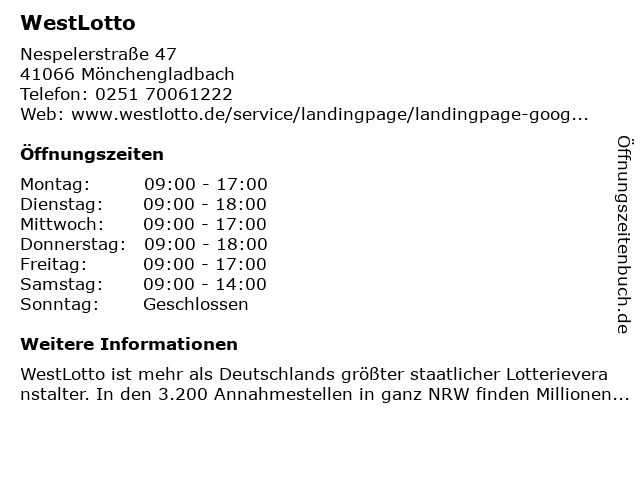 | Öffnungszeiten WestLotto in Mönchengladbach anzeigen | |