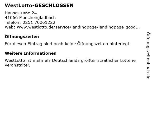 Öffnungszeiten WestLotto-GESCHLOSSEN in Mönchengladbach anzeigen