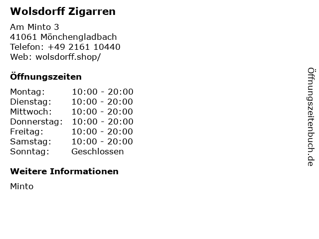 | Öffnungszeiten Wolsdorff Zigarren in Mönchengladbach anzeigen | |