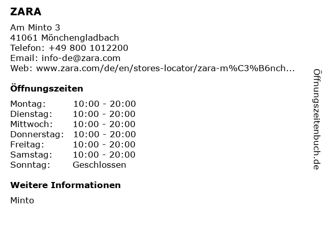 | Öffnungszeiten ZARA in Mönchengladbach anzeigen | |