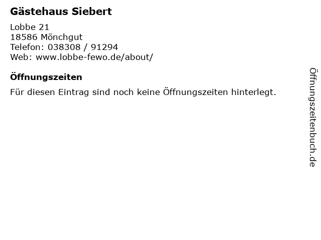 | Öffnungszeiten Gästehaus Siebert in Mönchgut anzeigen | |