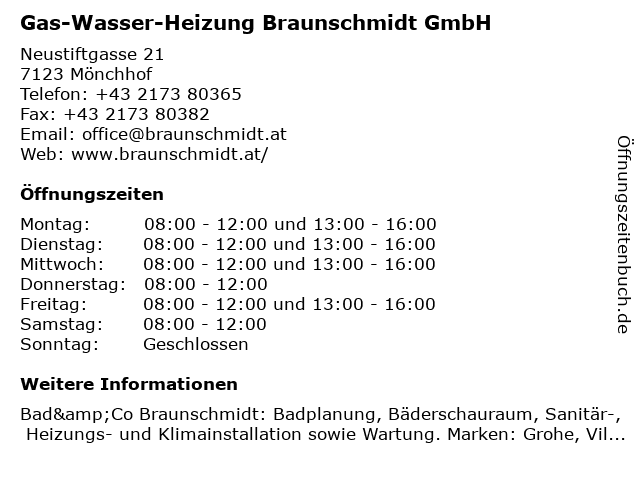 1 4 1a Installateur - Michael Braunschmidt Elektro-Gas-Wasser-Heizung (Entfernung: 0,88 km) Stiftsg 73, 7123 Mönchhof 5 Dr. med. univ. Gernot Braunschmidt, Facharzt für Zahn-, Mund- u. Kieferheilkunde (Entfernung: 8,64 km) Seestraße 81, 7141 Podersdorf am See 6 |