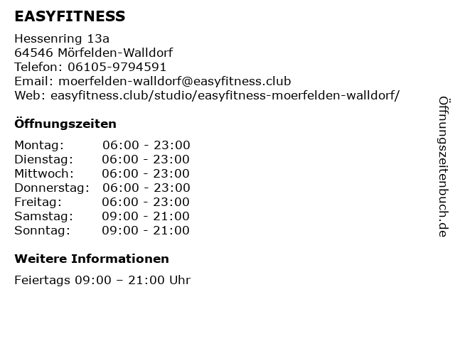 | Öffnungszeiten EASYFITNESS in Mörfelden-Walldorf anzeigen | |