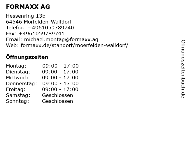 | Öffnungszeiten FORMAXX AG in Mörfelden-Walldorf anzeigen | |