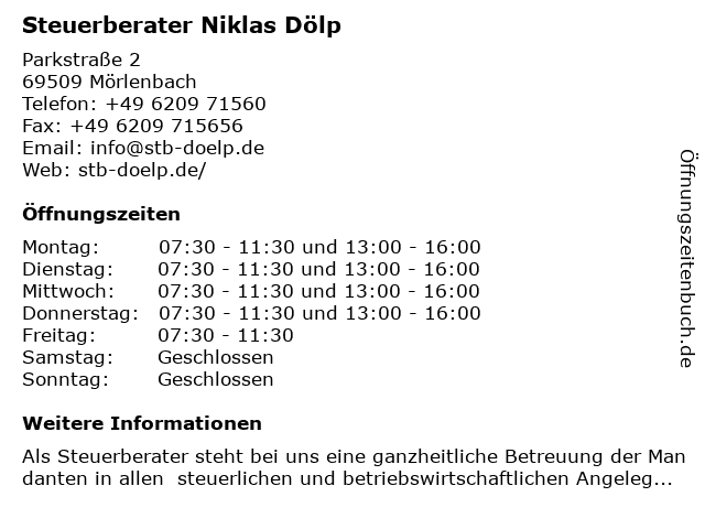 Öffnungszeiten Steuerberater Niklas Dölp in Mörlenbach anzeigen | |