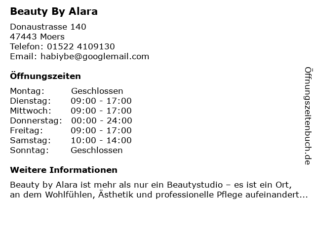 | Öffnungszeiten Beauty By Alara in Moers anzeigen | |