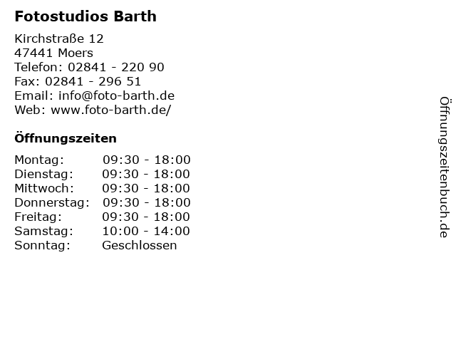 | Öffnungszeiten Fotostudios Barth in Moers anzeigen | |
