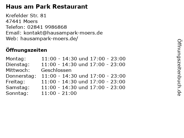 | Öffnungszeiten Haus am Park Restaurant in Moers anzeigen | |