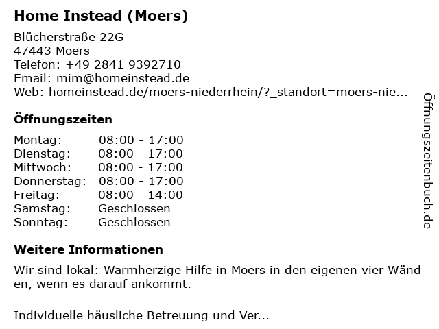 | Öffnungszeiten Home Instead (Moers) in Moers anzeigen | |