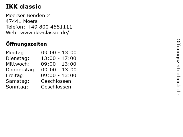 | Öffnungszeiten IKK classic in Moers anzeigen | |
