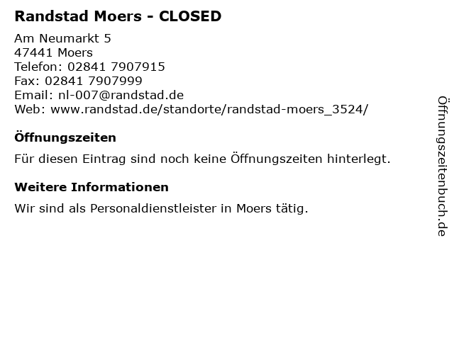 | Öffnungszeiten Randstad Moers - CLOSED in Moers anzeigen | |