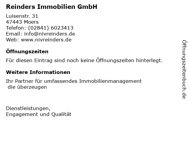 | Öffnungszeiten Reinders Immobilien GmbH in Moers anzeigen | |