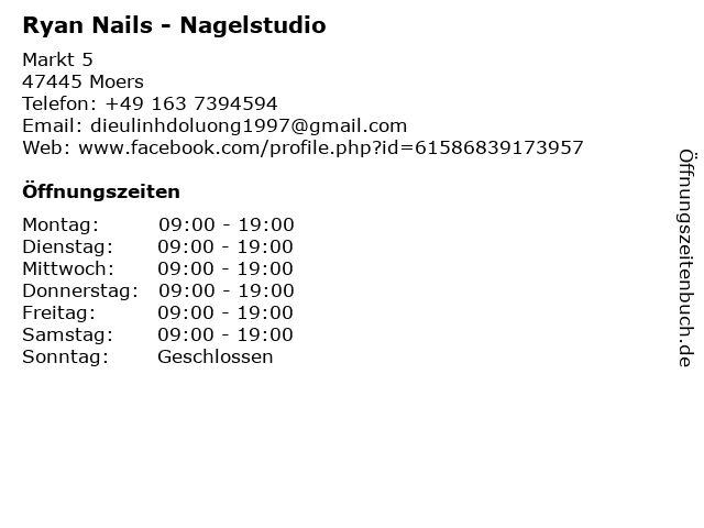 | Öffnungszeiten Ryan Nails - Nagelstudio in Moers anzeigen | |