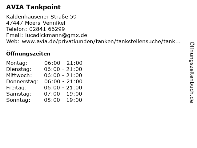 | Öffnungszeiten AVIA Tankpoint in Moers-Vennikel anzeigen | |