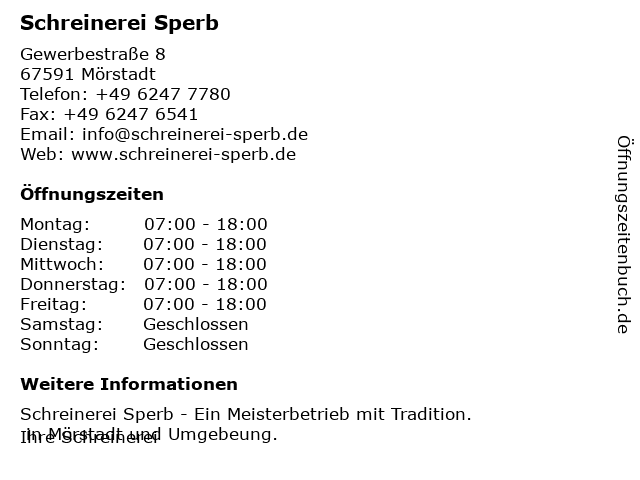 | Öffnungszeiten Schreinerei Sperb in Mörstadt anzeigen | |