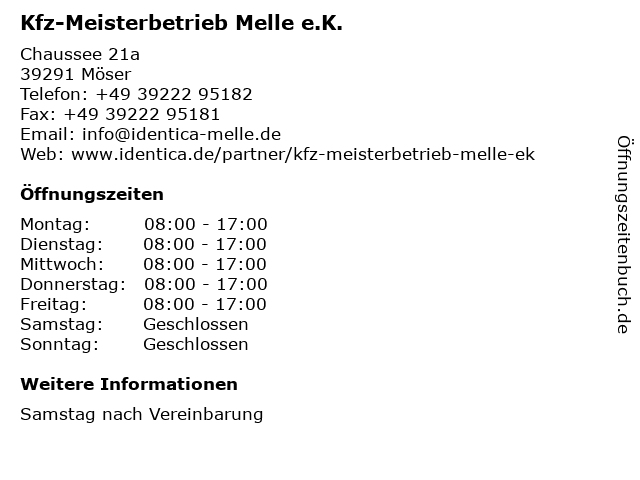 | Öffnungszeiten Kfz-Meisterbetrieb Melle e.K. in Möser anzeigen | |