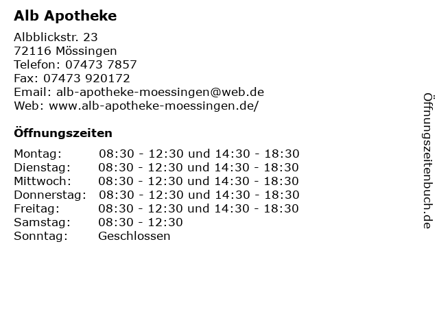 | Öffnungszeiten Alb Apotheke in Mössingen anzeigen | |