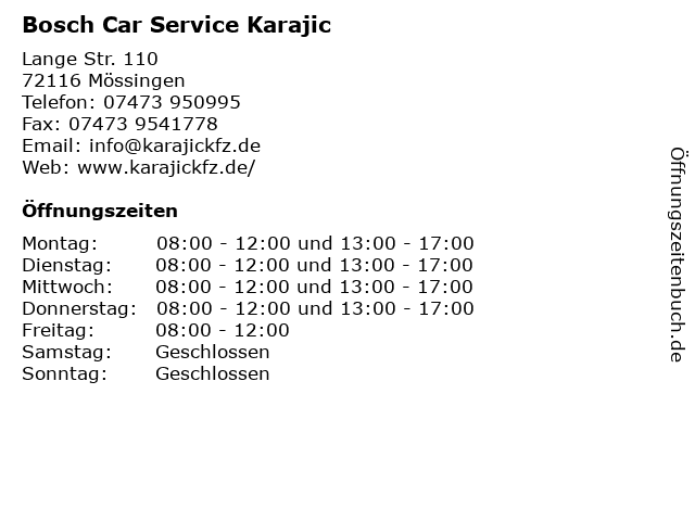 | Öffnungszeiten Bosch Car Service Karajic in Mössingen anzeigen | |