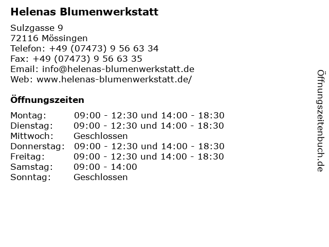 | Öffnungszeiten Helenas Blumenwerkstatt in Mössingen anzeigen | |
